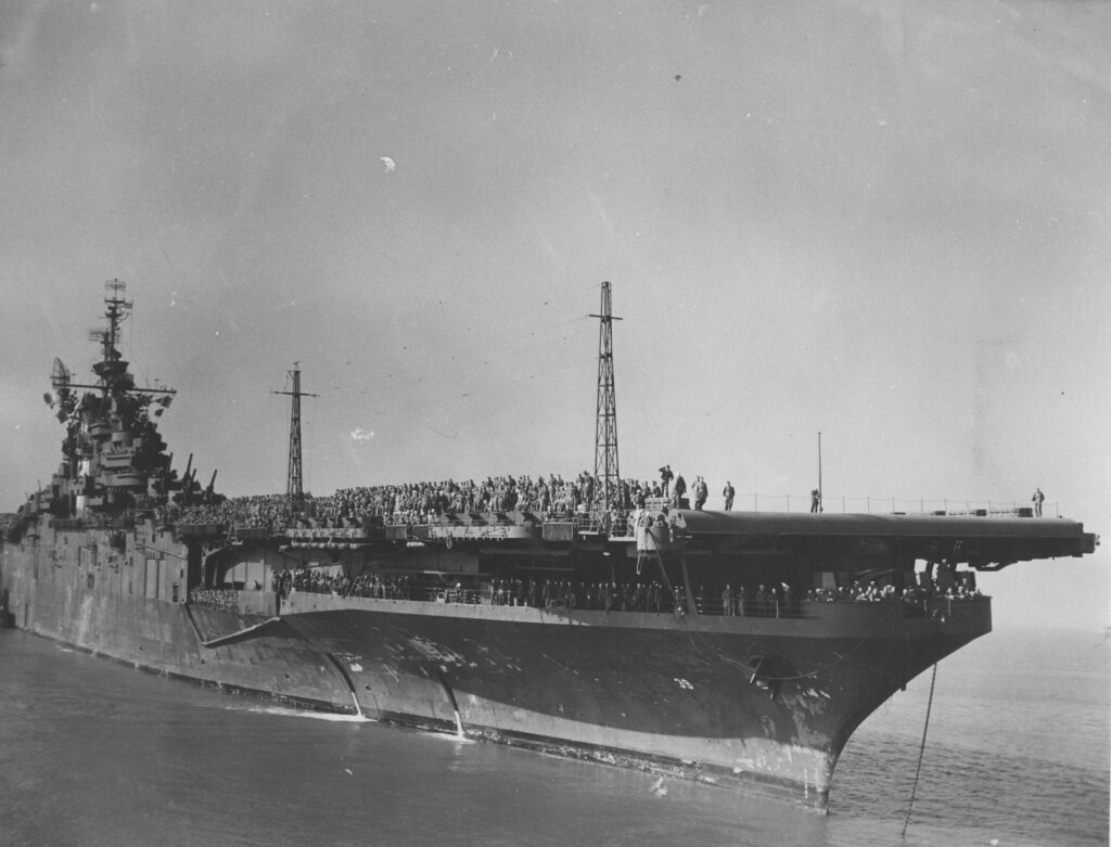 “USS Lake Champlain with Returning Personnel” November 27, 1945. National Archives photo 336-H-33-L16091. Photographic Albums of Prints of Hampton Roads Port of Embarkation. NAID: 138926945. Unrestricted.