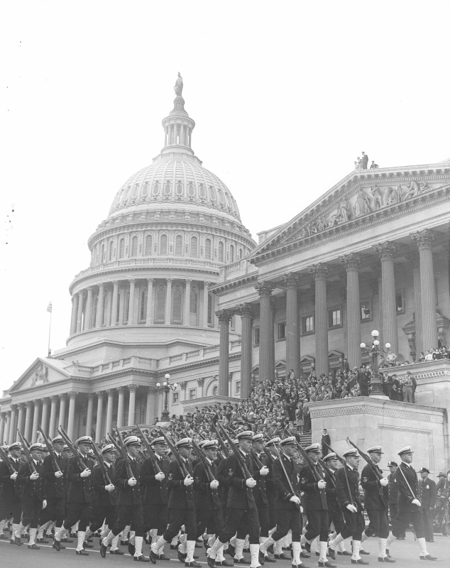 “Troops march past Capitol building” October 5, 1945. National Archives photo 73-2049. Photographs Relating to the Administration, Family, and Personal Life of Harry S. Truman. NAID: 338955194. Unrestricted.